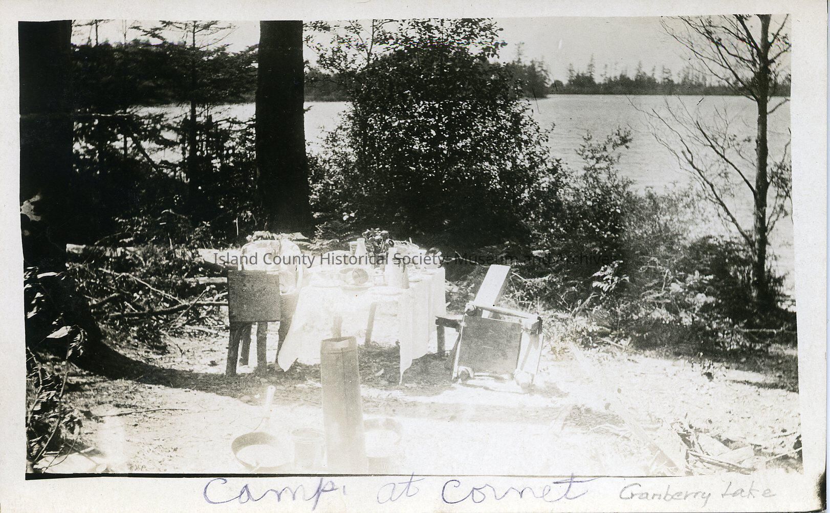 A photo ofa camp sight. Handwritten on the front is "Camp at Cornet. Cranberry Lake." Handwritten on the back is "Cranberry Lake."Made/Created