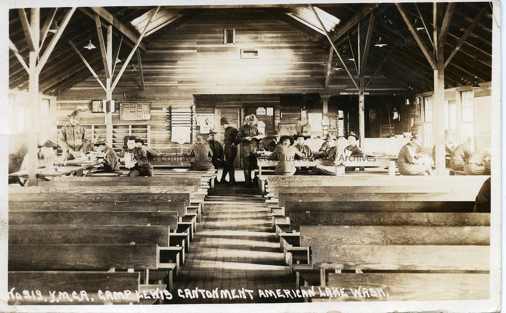 A photo of inside of a building with several people there. Handwritten on the front is "----Camp Lewis Cantonment American Lake Wash." Handwritten on the back is a letter to Mr. Harold Hill, Colby Hotel, Everett, Wash. --from Bud."
