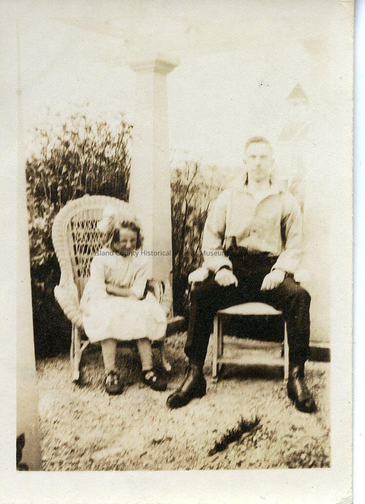 A photo of a man ans a young girl sitting in chairs. Handwritten on the back is "Phyllis & Harold."