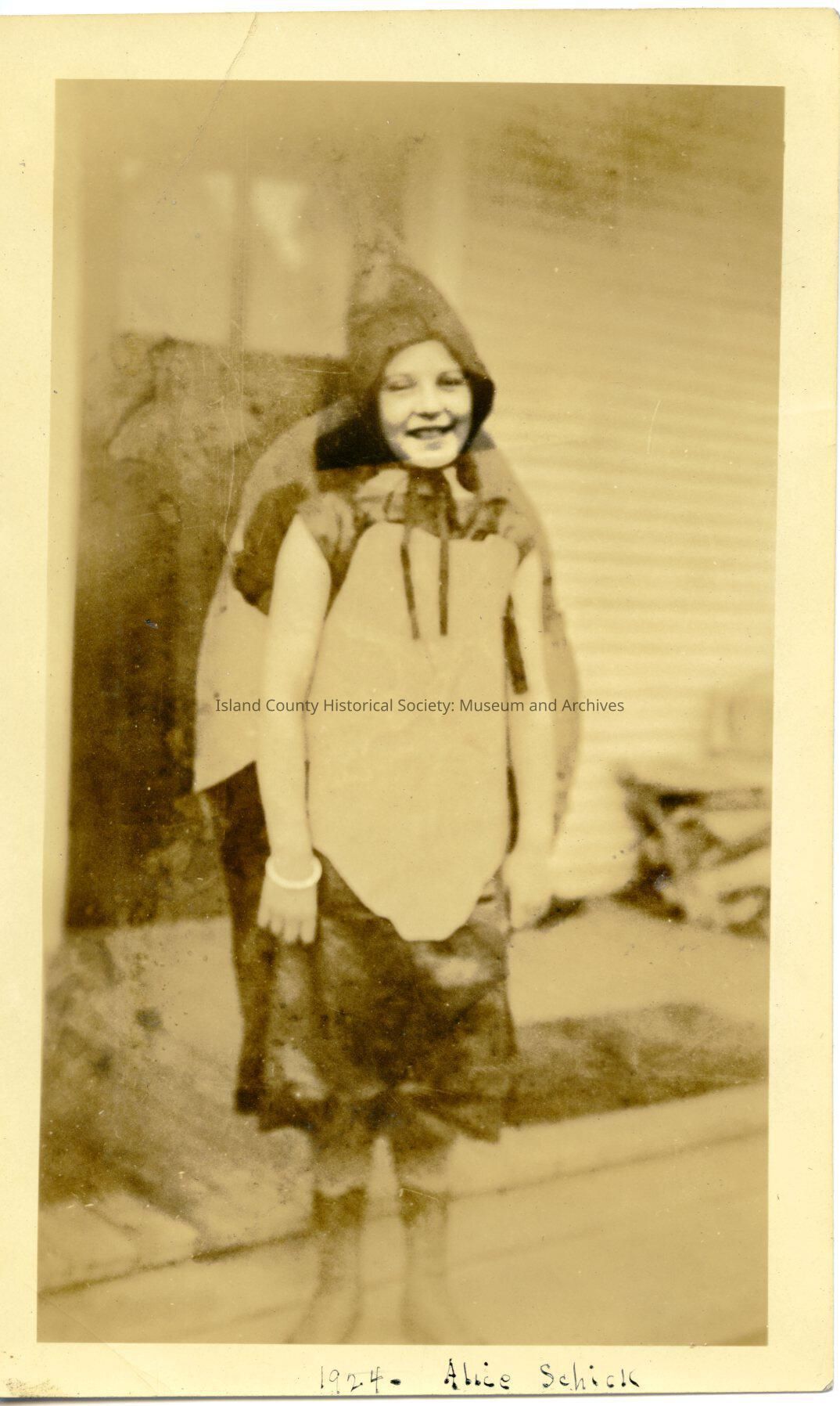 A black and white photo of a girl wearing possibly a costume - pointed head gear, bracelet on her right hand, mid-calf boots. She is in front of a wood building with a wood planked step or porch. On the bottom: "1924 - Alice Schick"