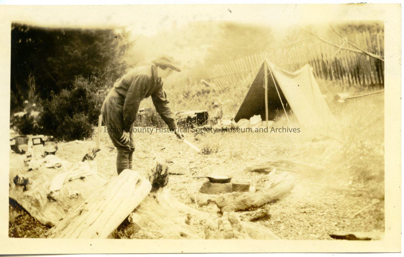A black and white photo of a woman at a camp site. Small tent, campfire. Sheis holding a knife and is bending over the campfire and the skillet. She is wearing trousers, long shirt and hat. There is a picket fence behind the tent. Beach, driftwood.
