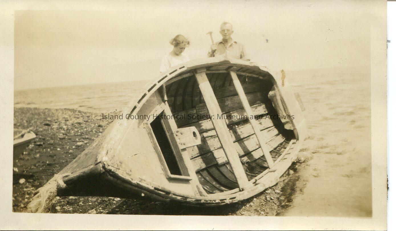 A black and white photo of a man and a woman standing behind a beached sailboat. It is lying on its side without the mast and sail. George and Avis Kellogg. Related photos: 2015.074.348-.350, 2015.074.352, 2015.074.355-.358.