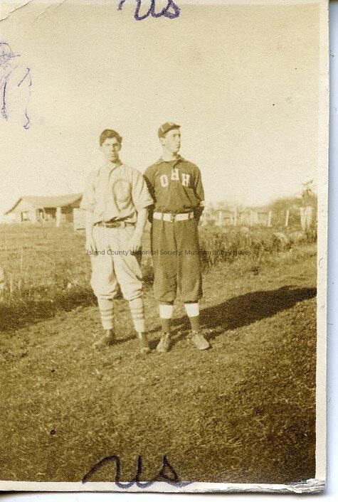 A photo of two men in baseball uniforms standing outside on grass. Handwritten on the front is "Us." Handwritten on the back is "Harold & Ted Hill."Made/Created