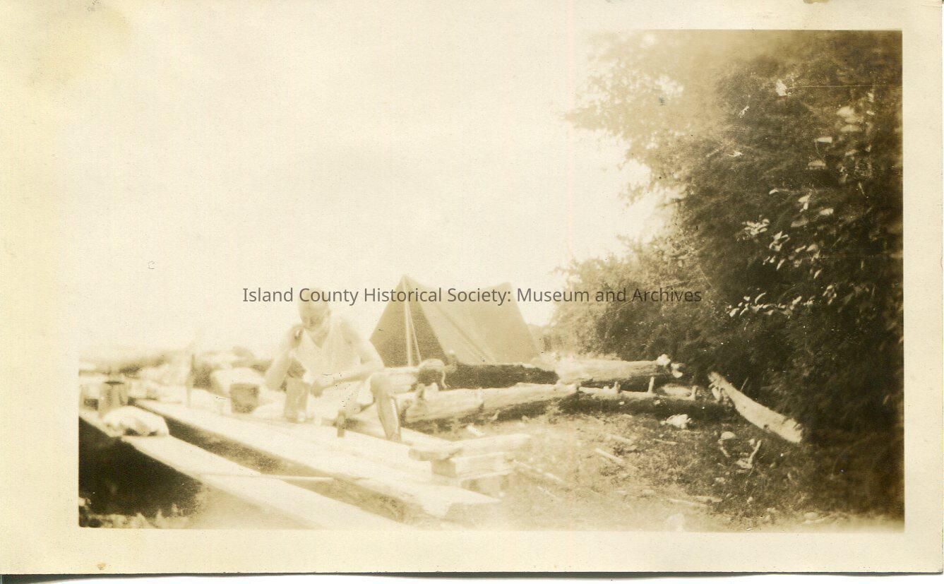 A black and white photo of a man sitting on some planks at the beach, tent behind him. Looks like he is shaving. Related photos: 2015.074.348-.350, 2015.074.352, 2015.074.355-.358.