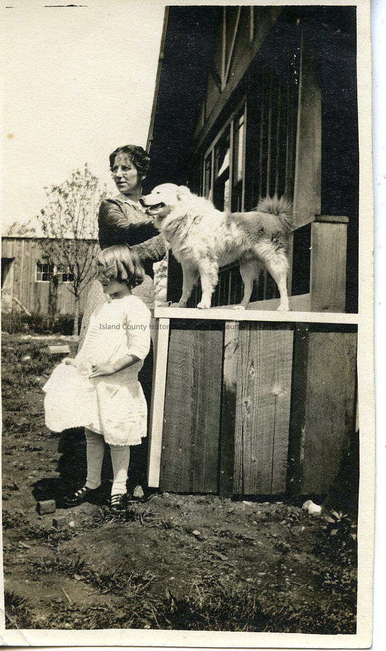 A photo of a woman, a young girl and a dog. They are standing by a building (barn?) and the dog is on a 'deck' of the building. On the back: Daisy & Phyllis & dog "Fritz"