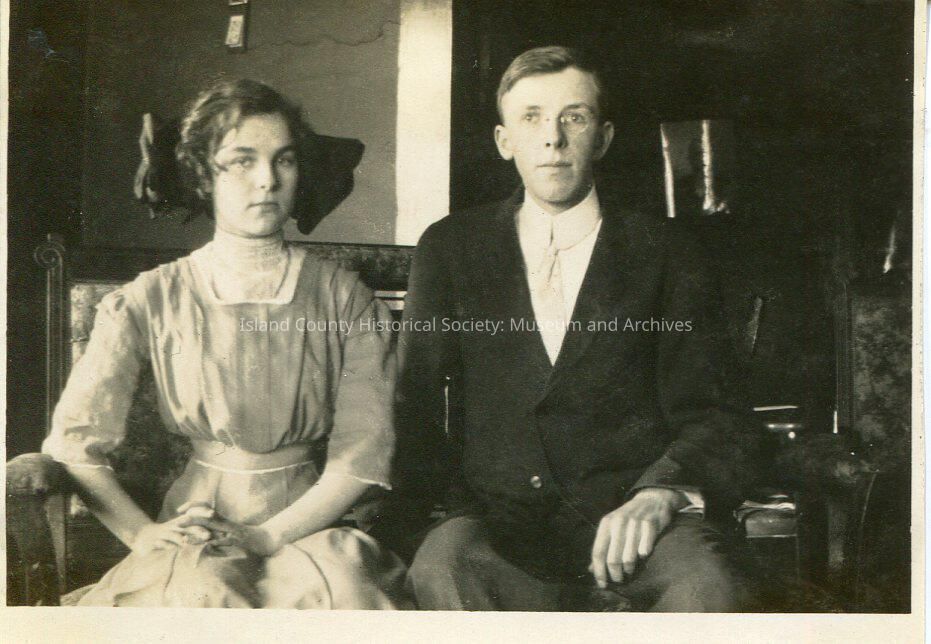 A black and white photo of a man and a woman sitting side by side. She is wearing a dress with a waistband, and a large bow on the back of her head. He is wearing a suit and glasses. George and Pauline (Polly) Hoag Kellogg ca. 1917