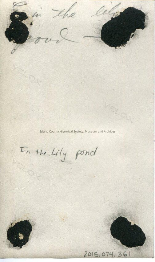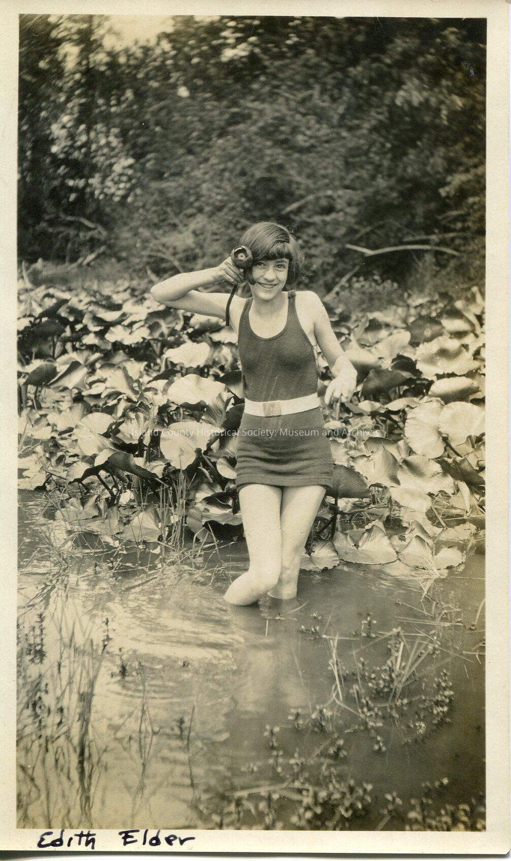 A black and white photo of a young woman in a swimsuit, standing in a pond with large water plants behind her, she is holding a lily pad flower in her right hand next to her right ear. On the bottom: "Edith Elder". On the back: "E in the lily pond -- In the lily pond"