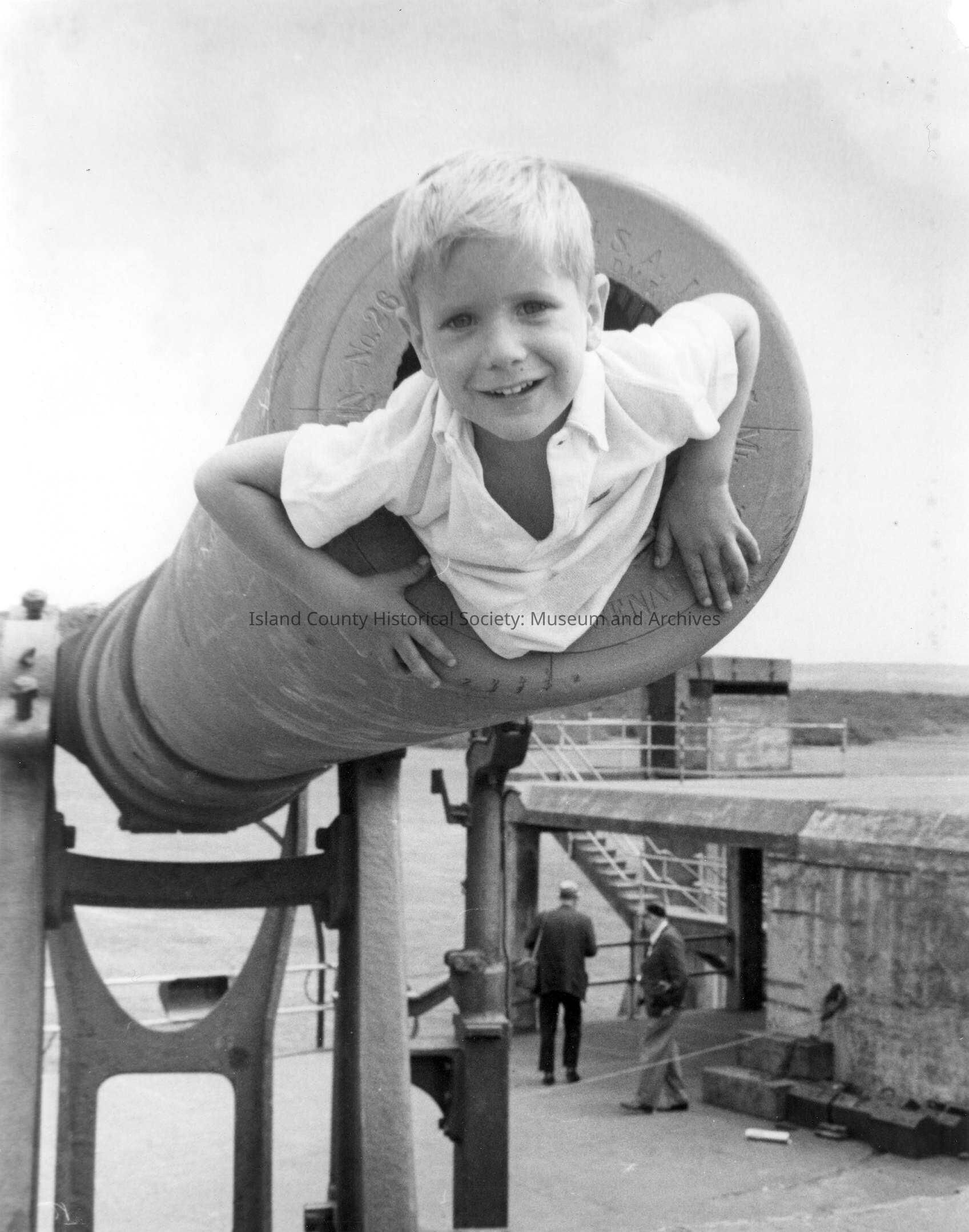 boy in gun barrel at Ft. Casey Titled: "Big Shot"