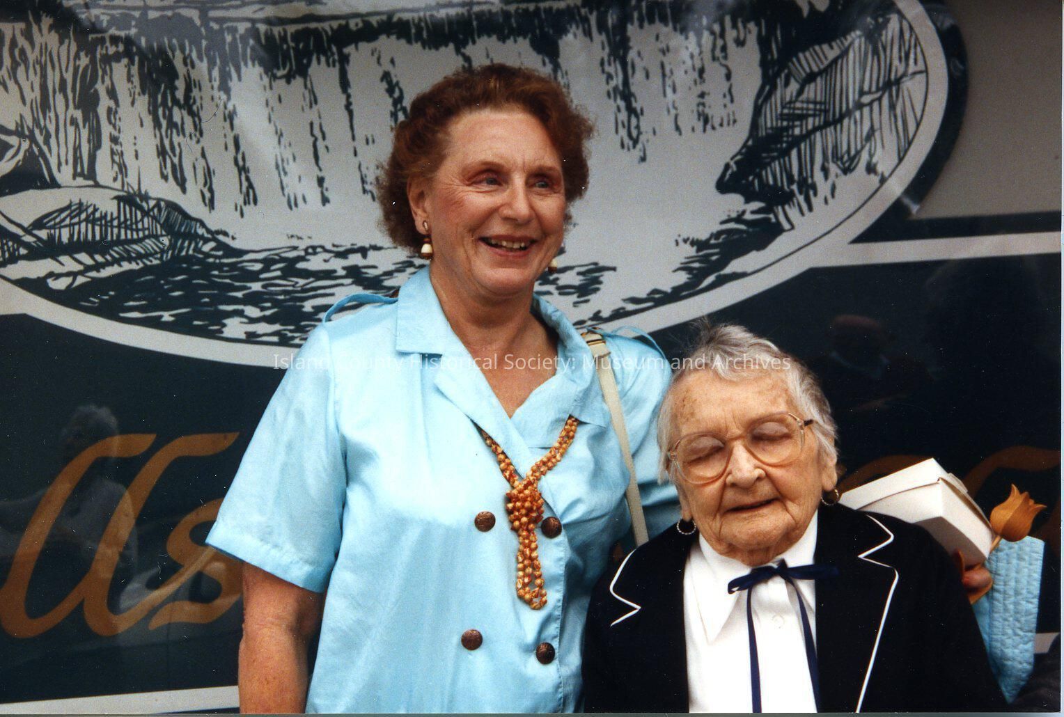 A photo of two women, one standing and the other woman sitting at a table. Handwritten on the back is "1993."