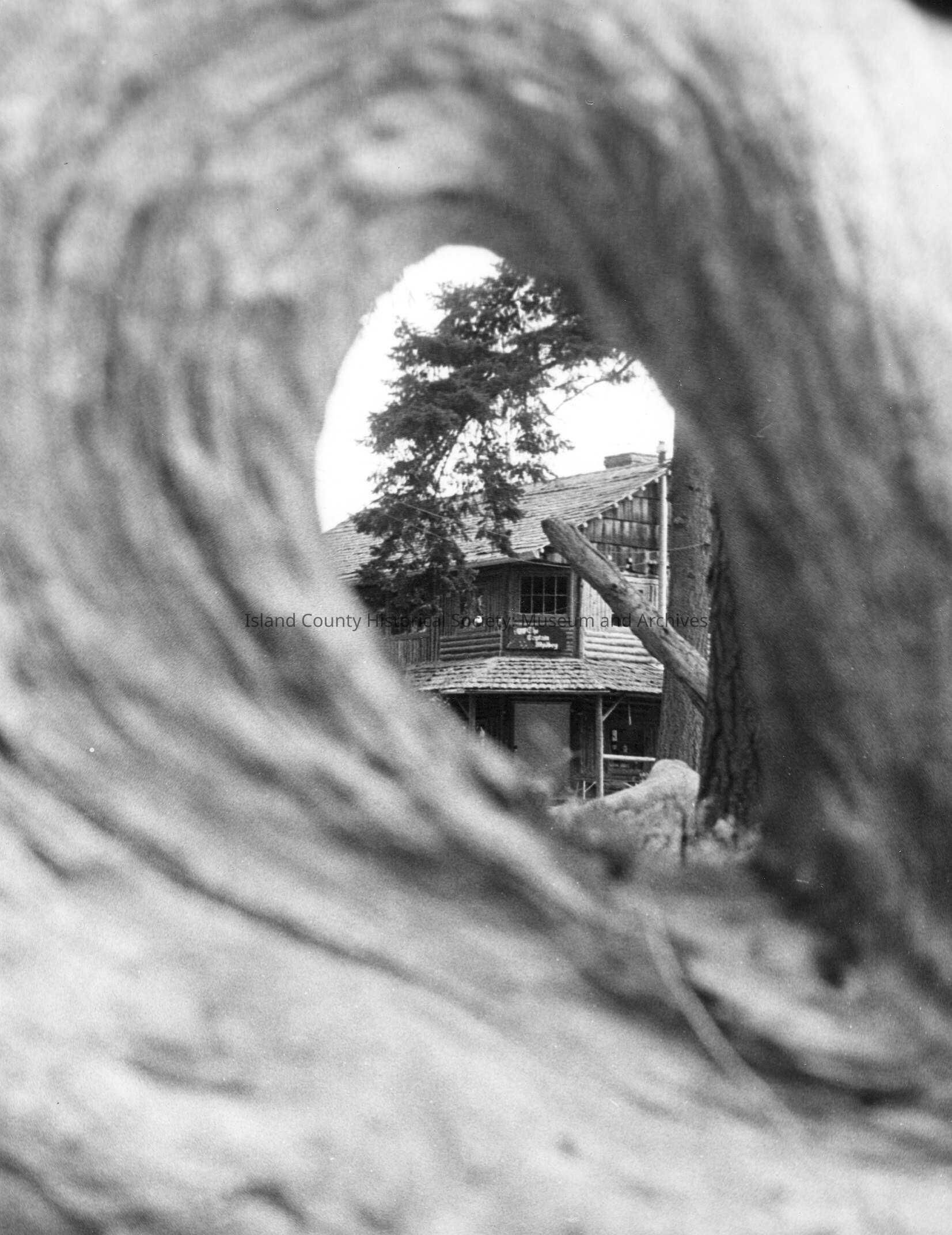 Knot hole view of the Captain Whidbey Inn Part of a Wallie Funk photo display