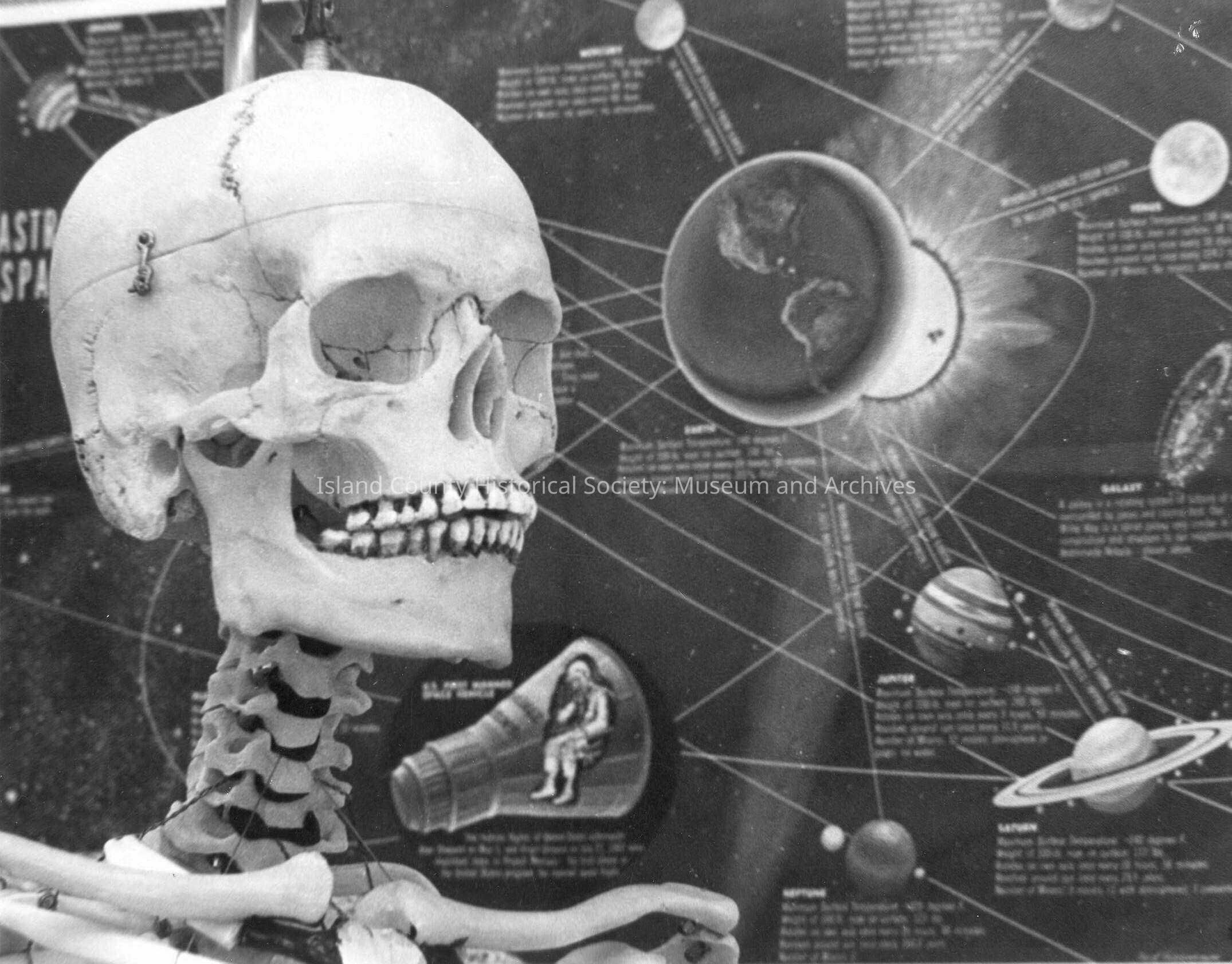 Display featuring a skeleton in the foreground and a chart of the solar system in the backgroun.