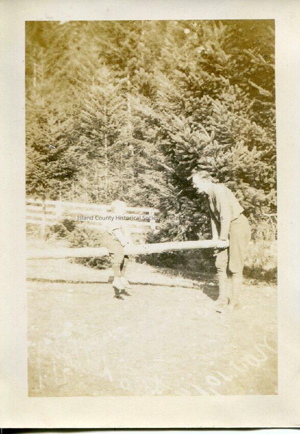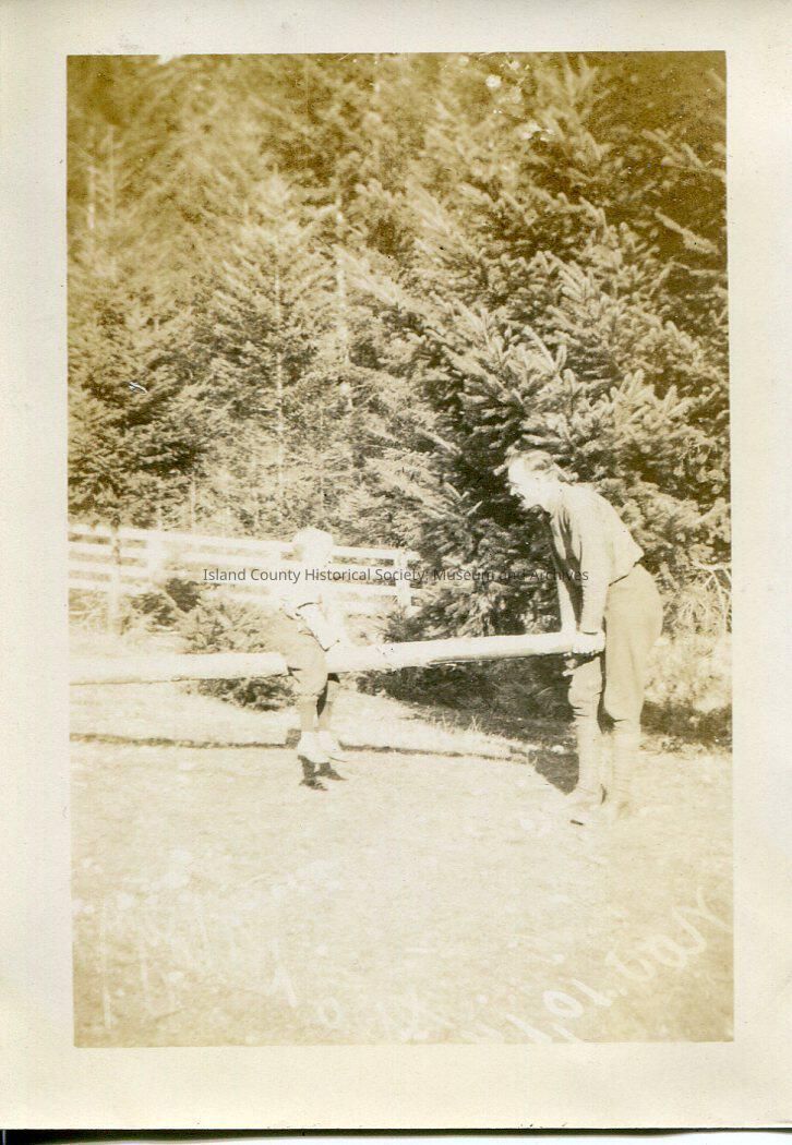 A black and white photo of a man wearing glasses, long-sleeved shirt, short trousers and long knee-lenght sock, holding one end of a cut-down tree. A young boy is sitting in the middle. Rail fence behind them and fir trees.
