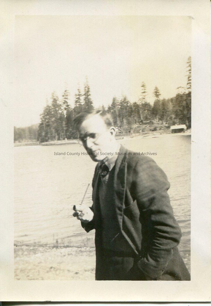 A black and white photo of a man wearing glasses, holding a long-stemmed pipe, a suit, standing on a beach. Behind him on the beach is a small cabin and just behind his head is another cabin. Trees.