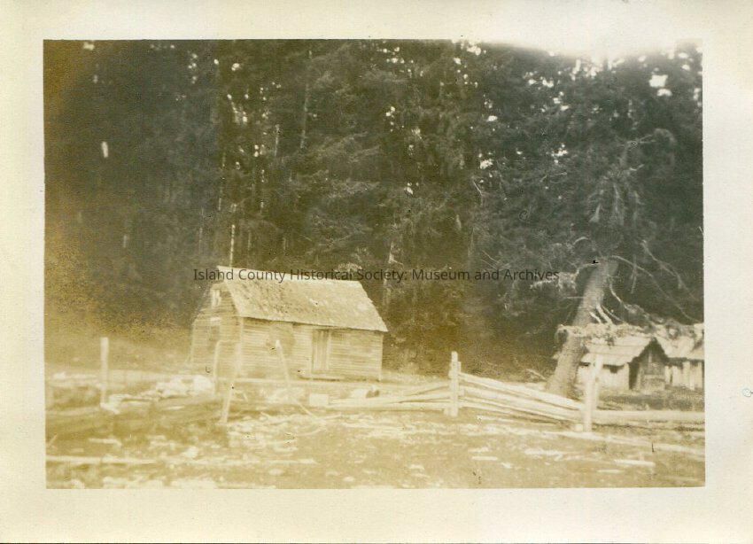 A black and white photo of a cabin with other cabins or sheds to the right in the photo. The cabin in the center of the photo has a door, boarded up windows in front and side and at the peak of the roof - possibly a loft or second story. There is a spit rail fence in front. Rocks. Trees.