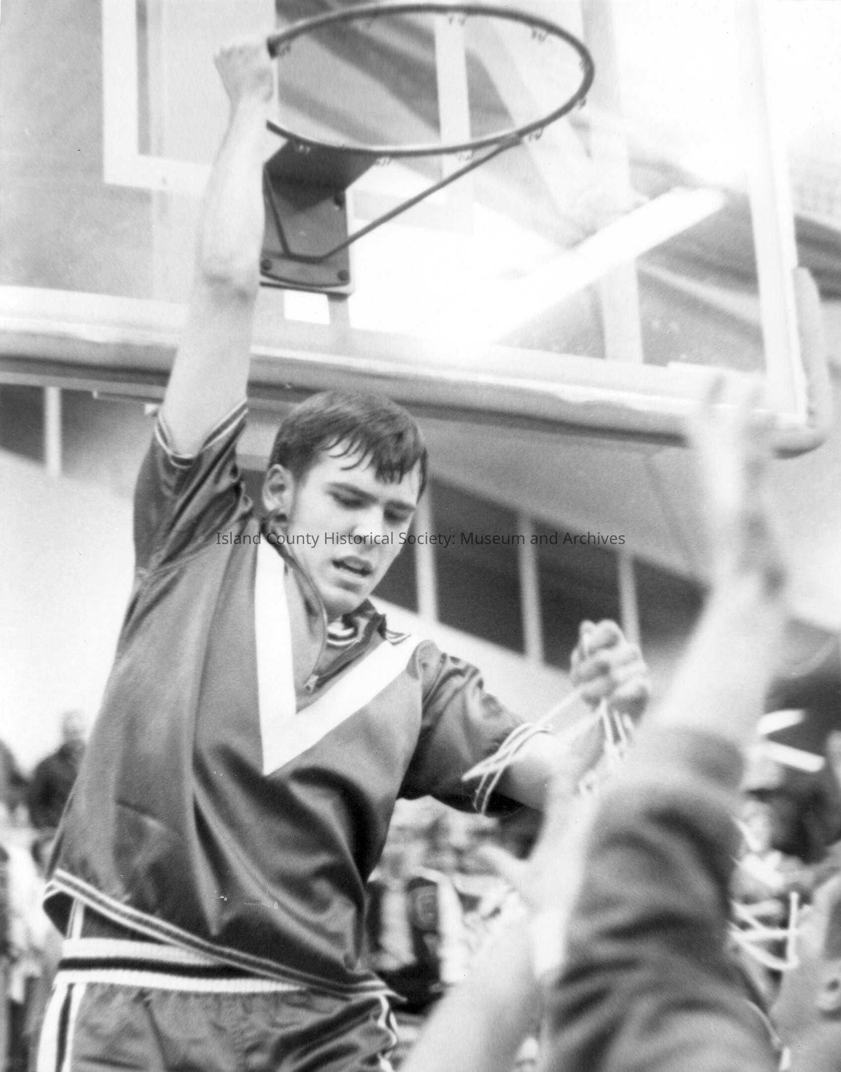 Basketball player taking down the net after winning the District Championship -- Coupeville High School boys basketball team