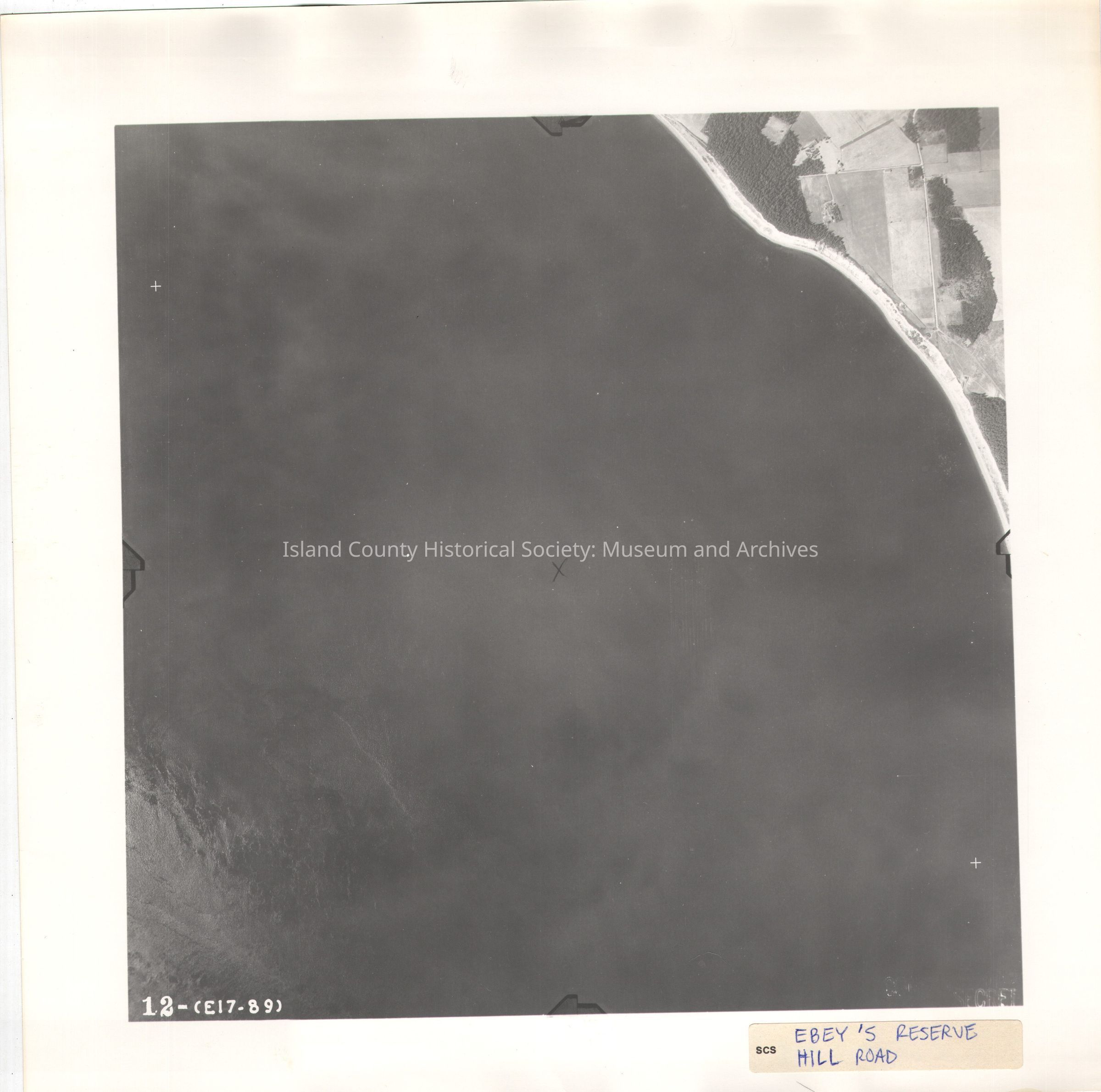Donated by Island Conservation District 12-(E17-89) Taken on 16 Aug 1942 Label in ink: Ebey's Reserve Hill Road Pencil X in the middle of the image. PIcture of water and a little bit of land in the upper right corner. See GIS for digital copies.