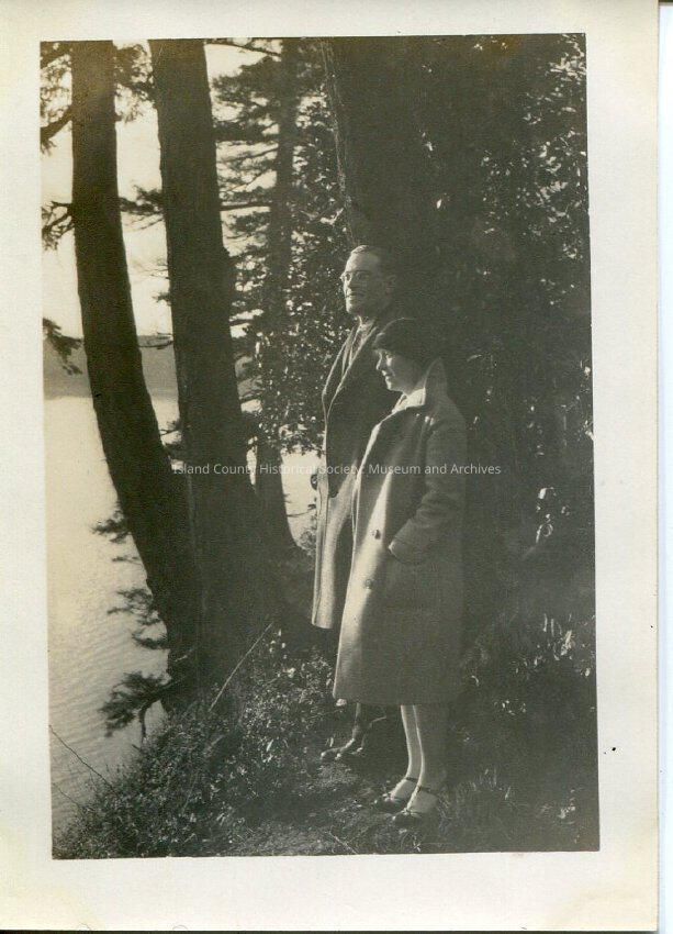 A black and white photo of a man and a woman standing in trees looking out at the beach. She is wearing a coat and hat and is the same as in 2015.074.374. He is wearing glaases, an overcoat. Related photos: 2015.074.373-.374.