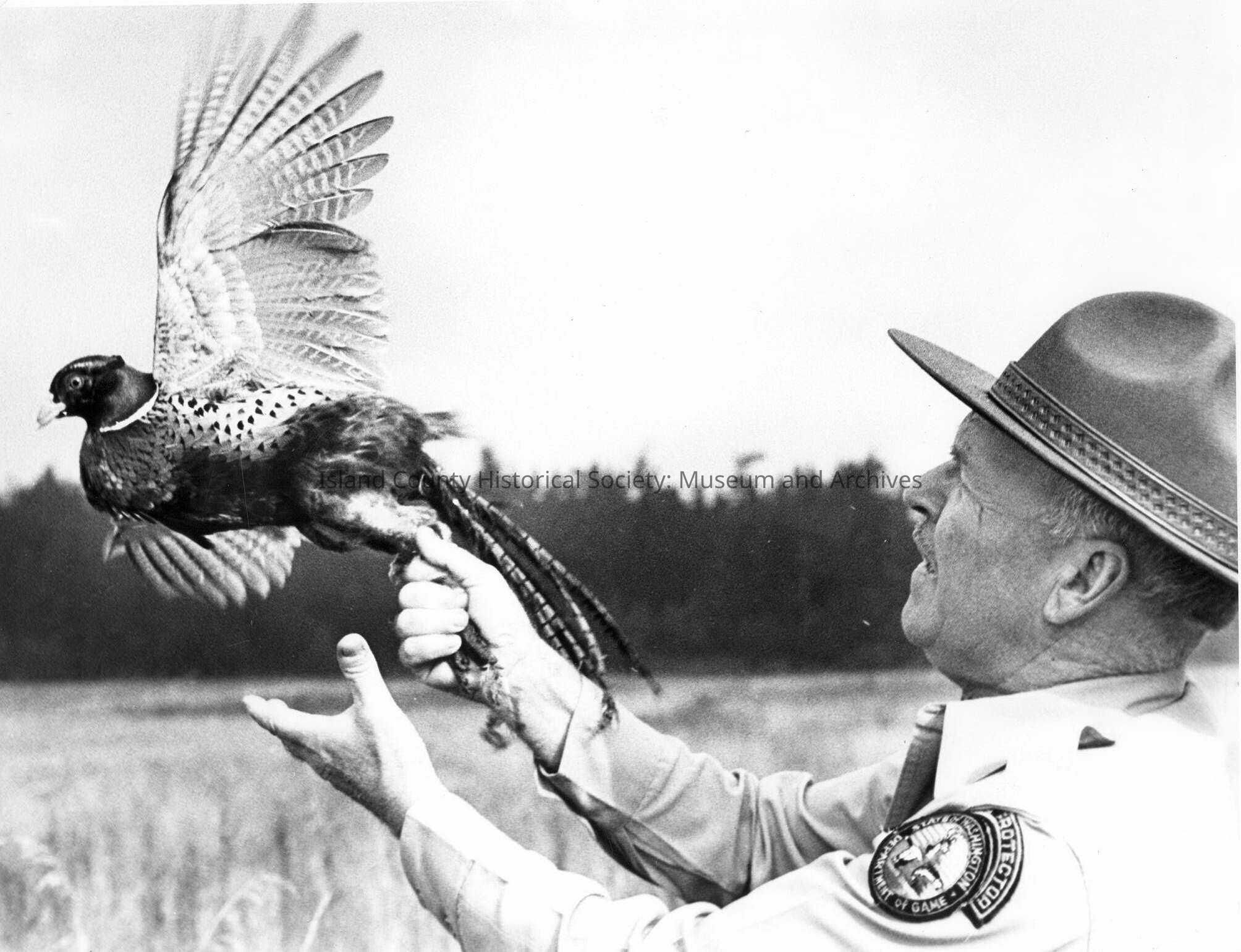Game Warden at the Whidbey pheasant farm holding a pheasant.