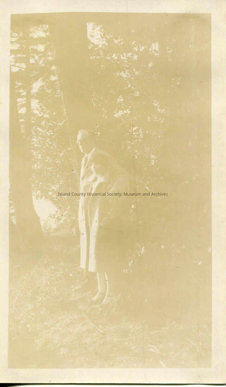 A black and white photo of a man and a woman standing in trees looking out at the beach. She is wearing a coat and hat and is the same as in 2015.074.373. He is wearing glaases, an overcoat and has his left arm around her.