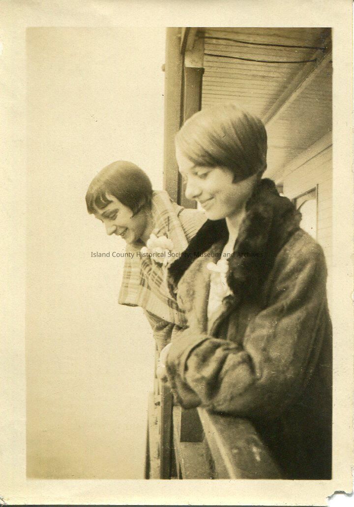 A black and white photo of two girls wearing coats (one has fur on the collar) standing in front of a structure, leaning on a railing and looking down. It is not clear if the structure is a boat/ferry or building.