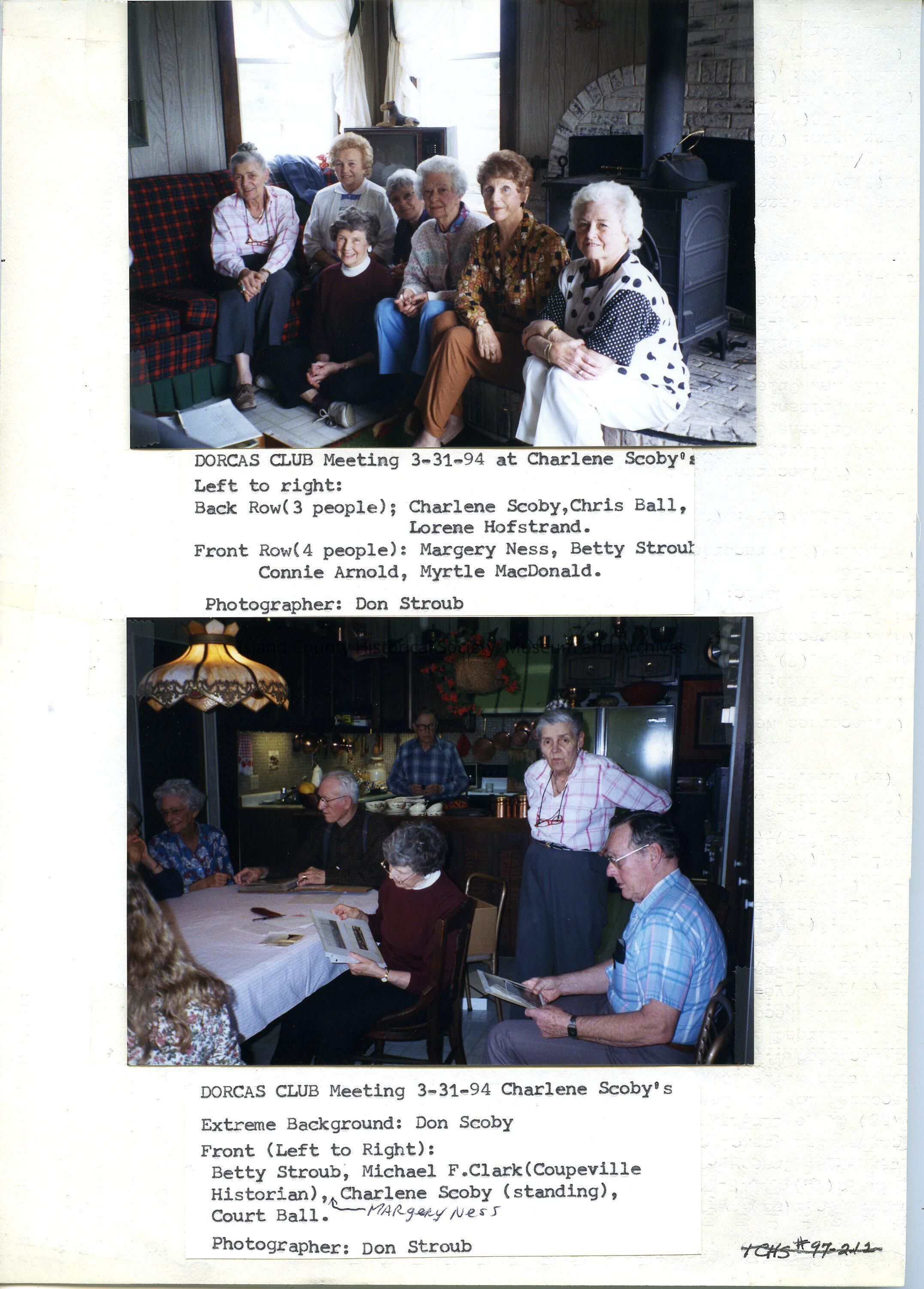 Two photos of several momen, inside a house, in the top photo. The lower photo is men and women inside a house. Typed on the front is "Dorcas Club meeting 3-31-94 at Charlene Scoby's." Names are typed out. The phographer is Don Stroub.