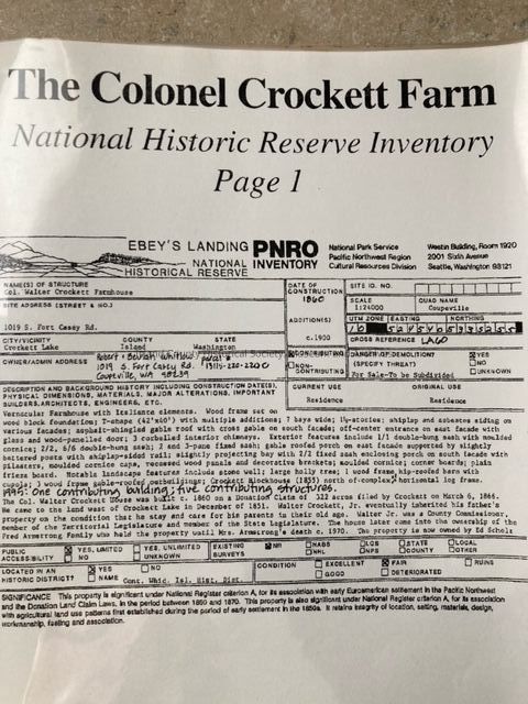 Crockett Family scrapbook compiled by Beulah Witlow- former owner of Crockett Farm. In a dark red binder. Contains lots of newspaper cut-outs and other documents many relating to Ebey's Prairie, but also Coupeville history.
