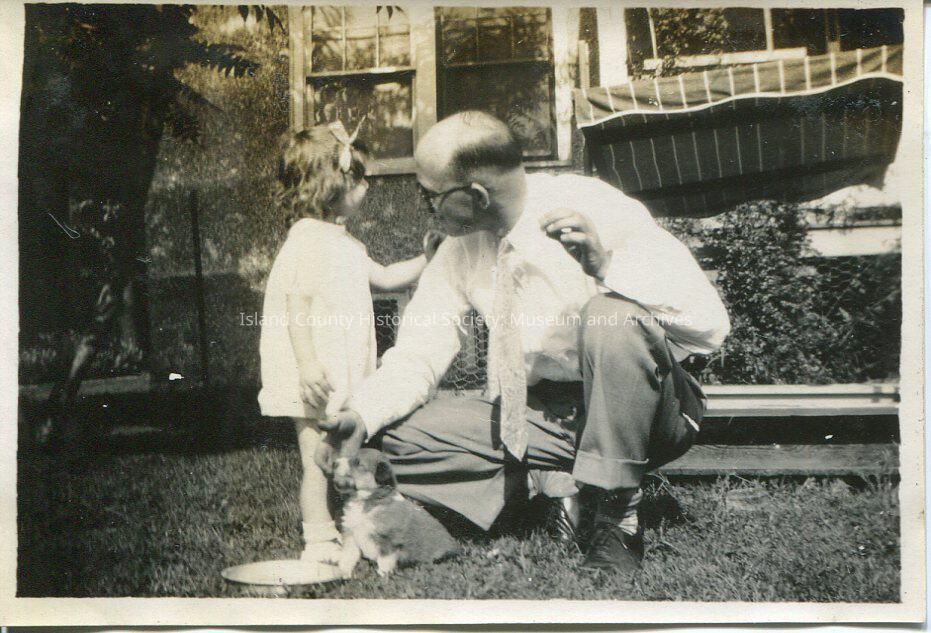 A black and white photo of a little girl wearing a dress, with a bow in her hair. She is standing beside a man with her hand on his right shoulder. The man is wearing glasses, tie, and is sqautting beside the girl, with his right hand on the puppy. They are in front of a house with a striped porch swing.