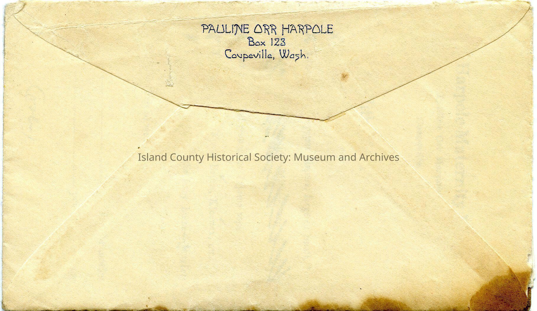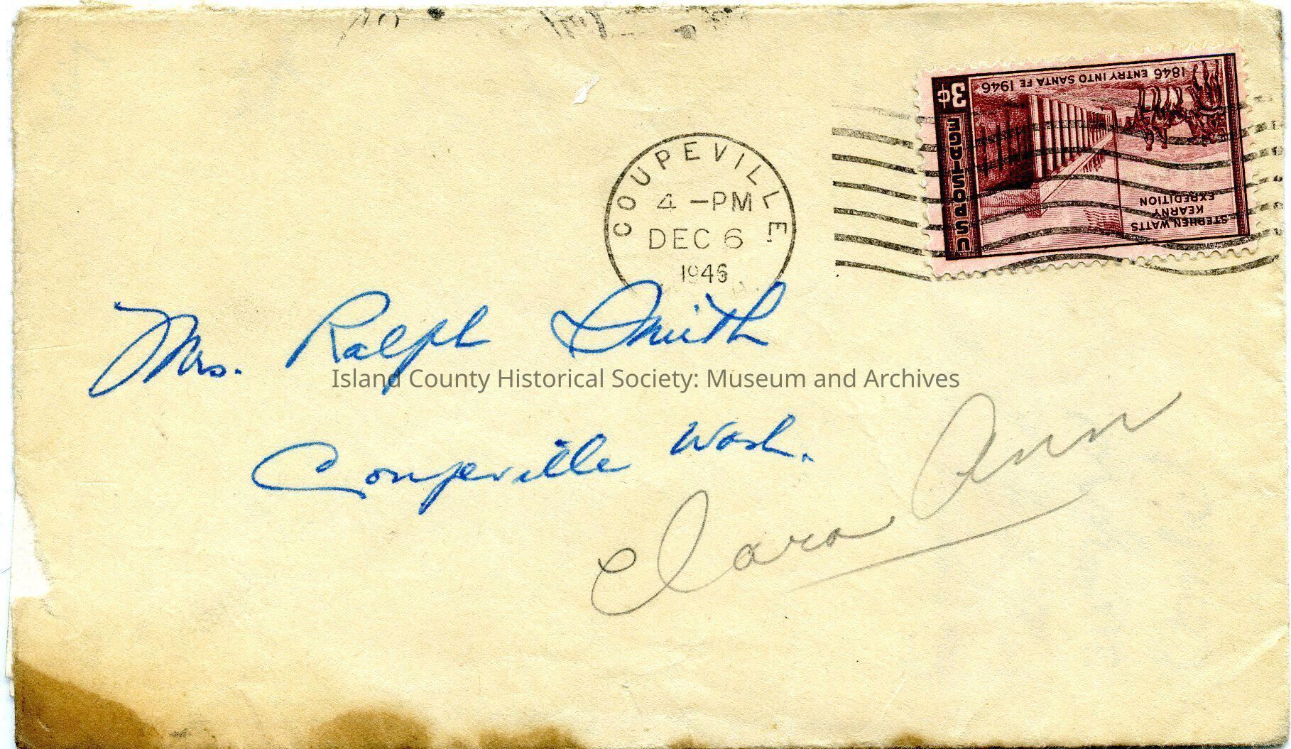 Envelope that contained the list 2016.111.007. Stamped Dec 6, 1946. On the front, written: Clara Ann