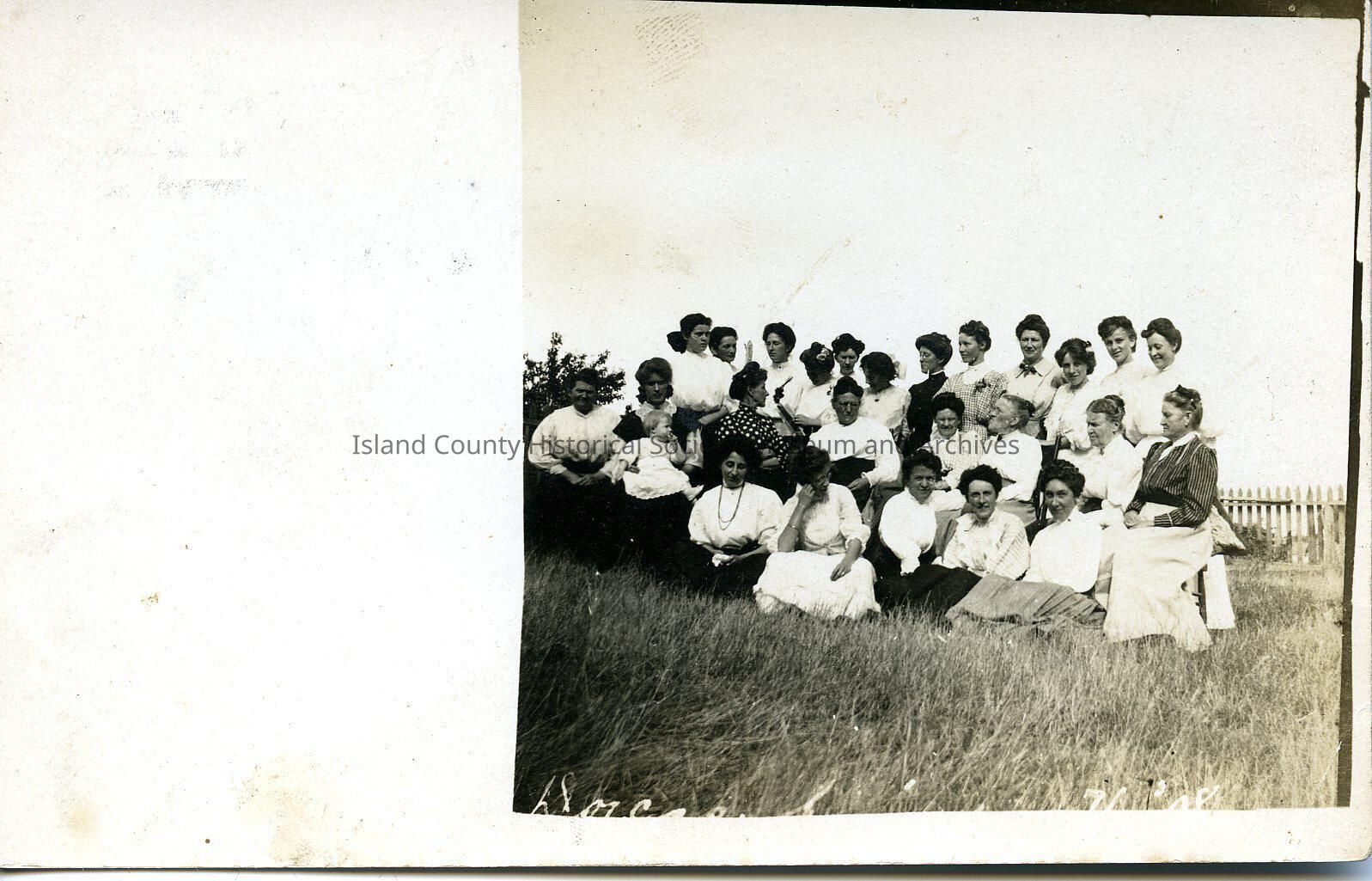 A photo of women standing, and some sitting, outside. Handwritten on the back is " Dorcas Society. (Written to) Mrs A. W. Monroe, San de Fuca, Wash. (Written from) Complimento of Mrs. C. Fisher, April 1st 1909 Taken July 23rd 1908 by C. P. Dyer."Lexicon