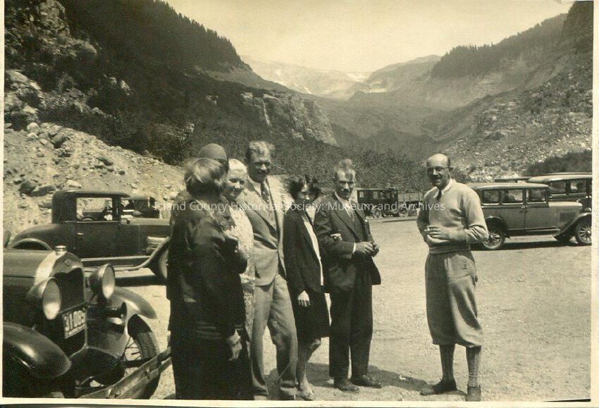 A black and white photo of a group of four women and three men standing in a parking area - several cars are parked around. There are mountains. Clarence Wolnur (Elida's brother) and Howard Kellogg