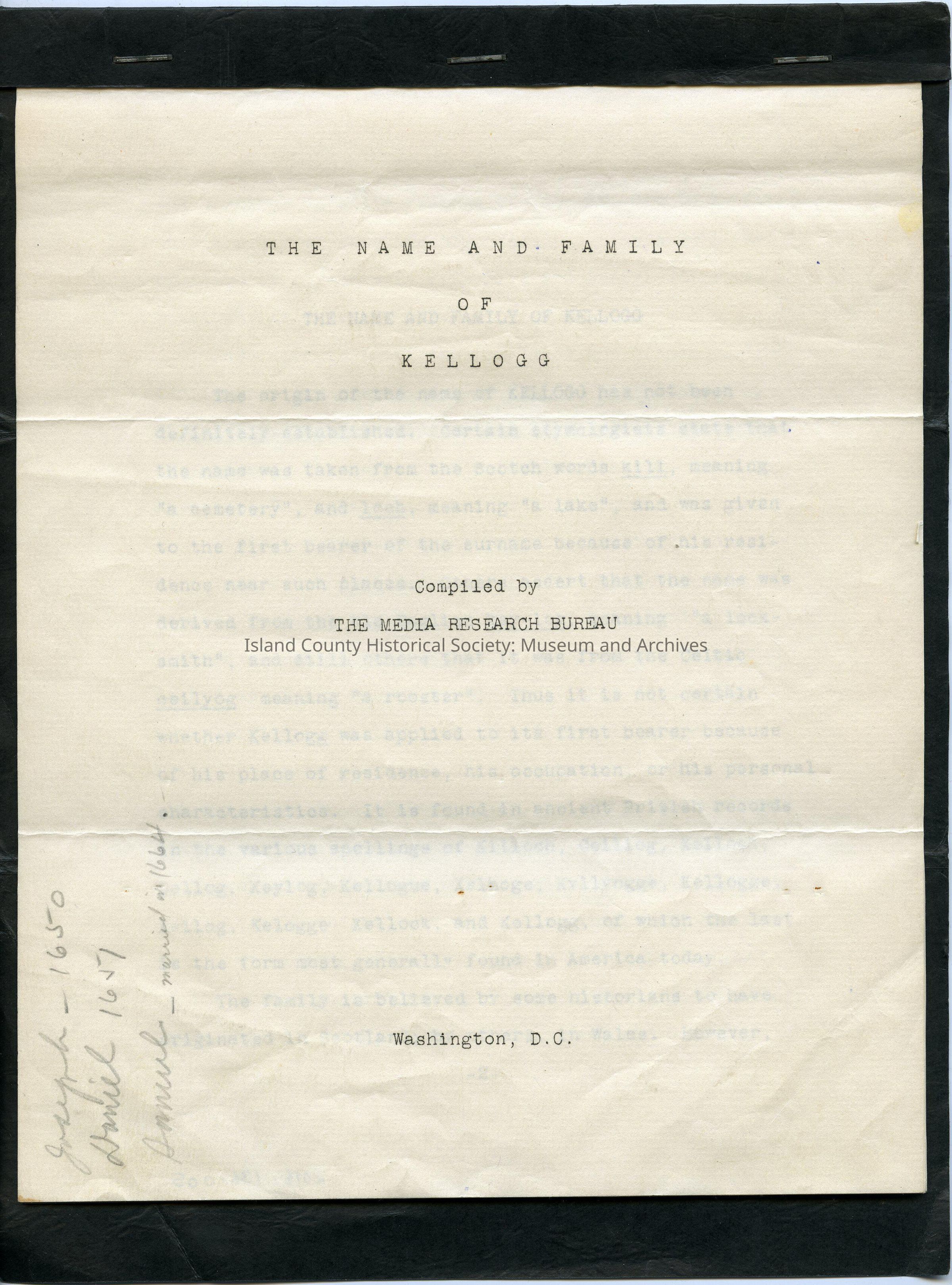 Bound notes compiled by the Media Research Bureau, Washington DC. 12 pages. typed on two kinds of paper- ecru and yellow (the latter is tracing paper). Pen and penciil notations. Three staples attaching into the blackcard (leather like design) with coat of arms, medeia research bureau address and inside border it reads "Genealogical and Historical Sketch"