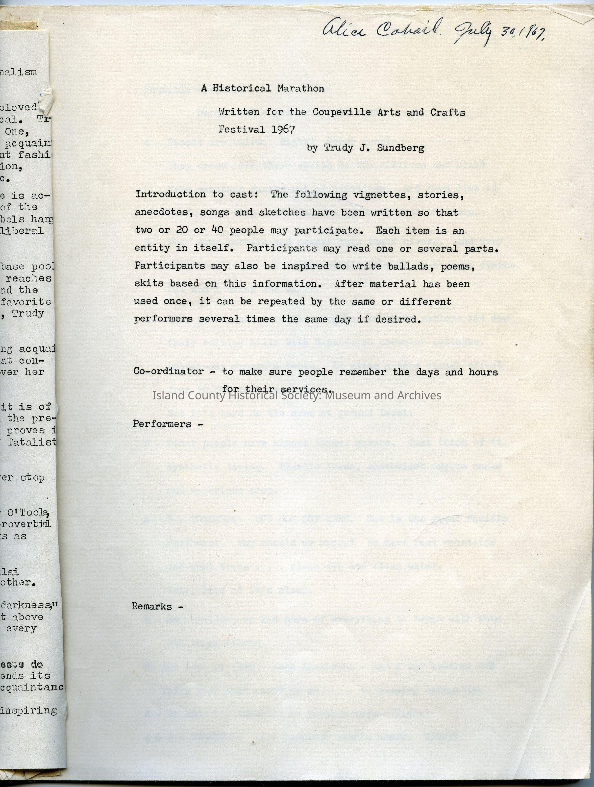 On the "Historical Marathon" at the Coupeville Arts and Crafts Festival. Inside are stories, poetry and parts of plays performed by Whidbey Playhouse Players. This is only a part of the booklet, so its beginning is the finishing point of a tale called "The Dromedary Queen". Written by Trudy Sundberg. 28 pages