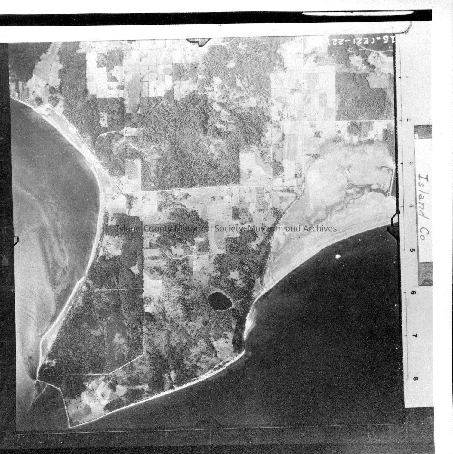Donated by Island Conservation District Adjoins 2015.023.001 and 2015.023.003 Taken in the 1940s? 15-(E21-22)) Double Bluff with Lancaster Lake with Lancaster and Double Shore roads. Label: Island Co. See GIS for digital copies