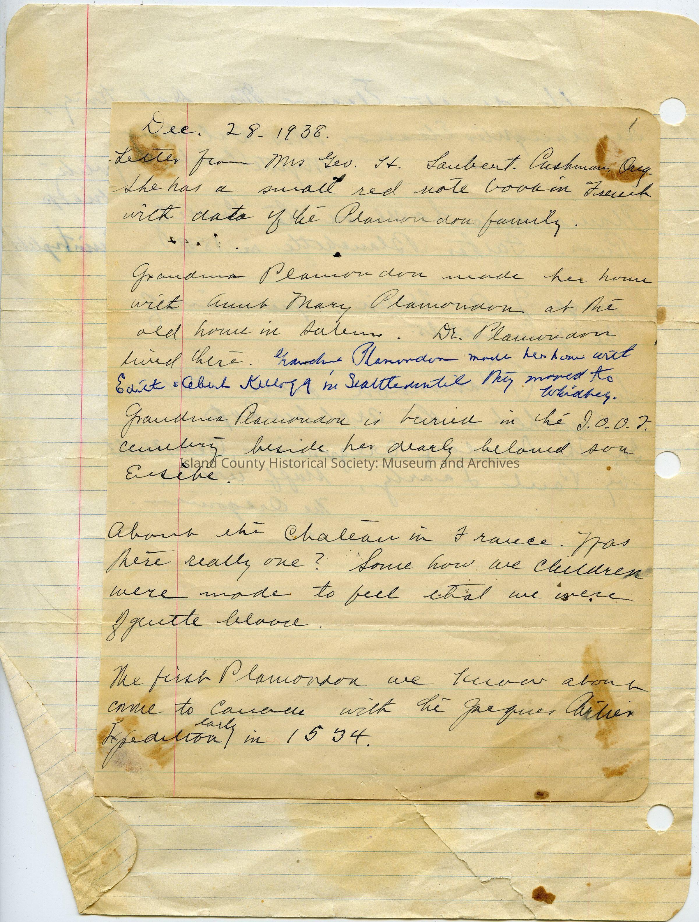 Notes presumably by Alice Cahail about family history. 13 pages. Mostly hand written in black ink, but some typed up and stuck onto a larger sheet of paper