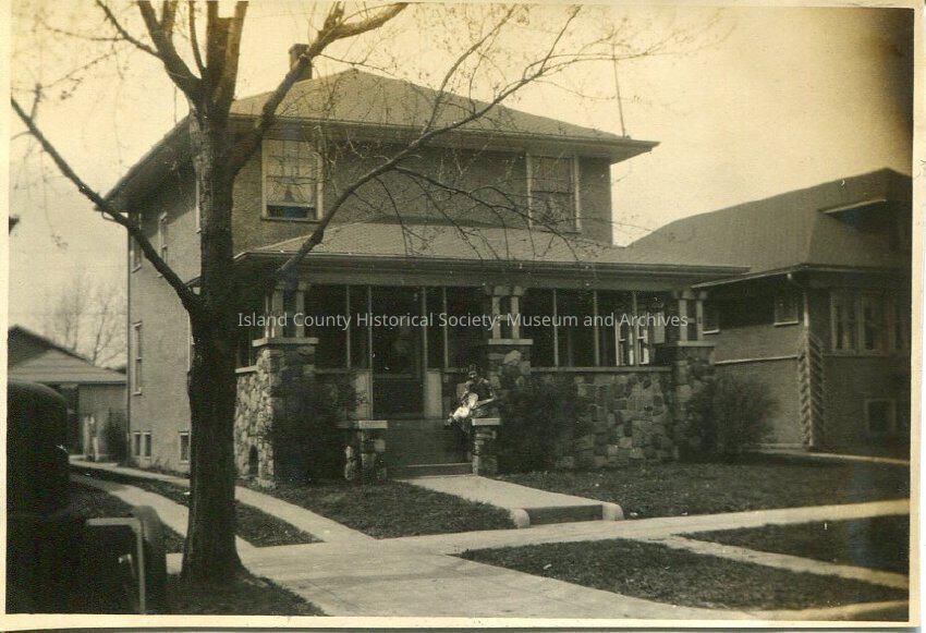 A black and white photo of a house with drivveway, sidewalks, front porch, riverstone base to the porch. Tree in front. Woman and baby or small child are sitting on the stone rail of the steps. The rear of a car with tire is just seen in the left side.