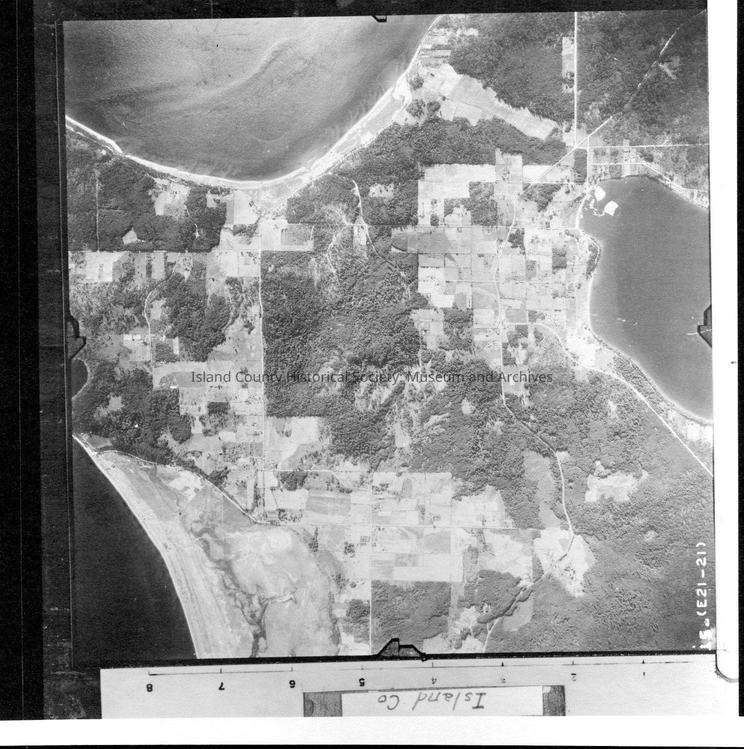 The end of Holmes harbor with a number of docks or objects in the water. The number is upsidedown and should be on the northern edge