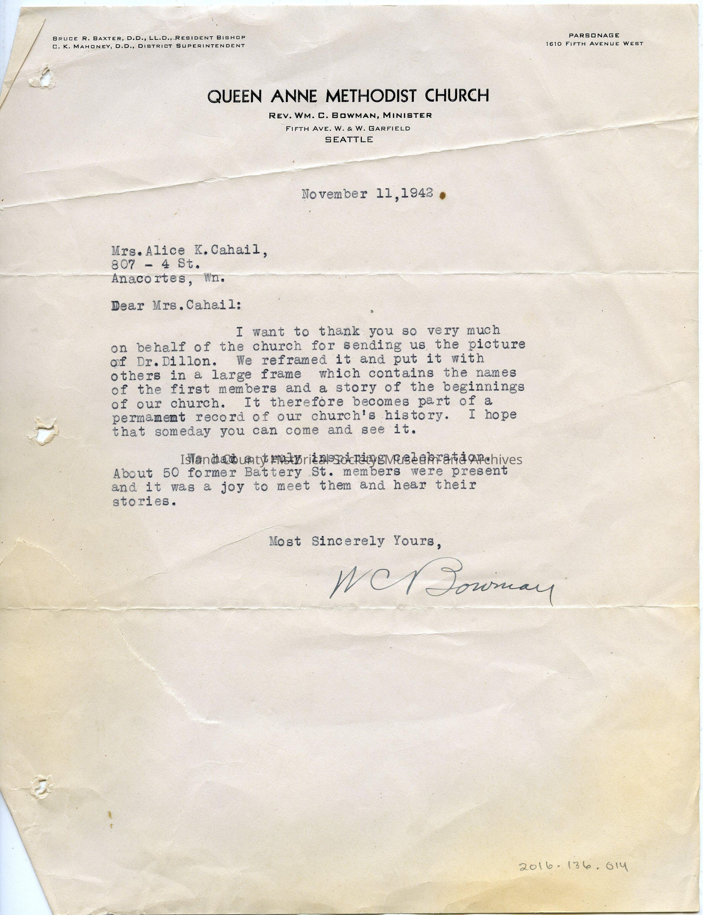 To Alice Cahail. 1 page. From WC Bowman of Queen Anne Methodist Church, Seattle