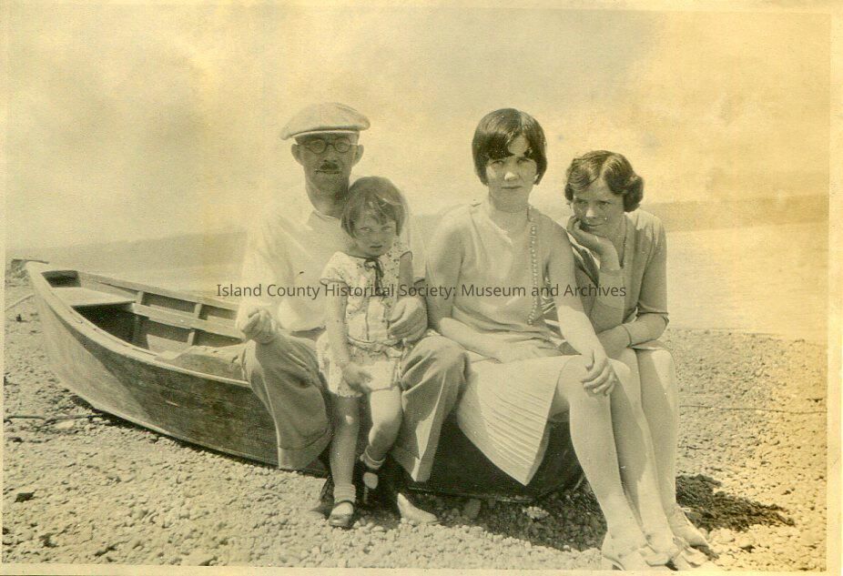 A black and white photo of a group of a man, two young women and a gril on the beach. They are all sitting on a row boat. Mountains in the background. The two young women and girl are wearing dresses. The man is wearing a flat cap and glasses.