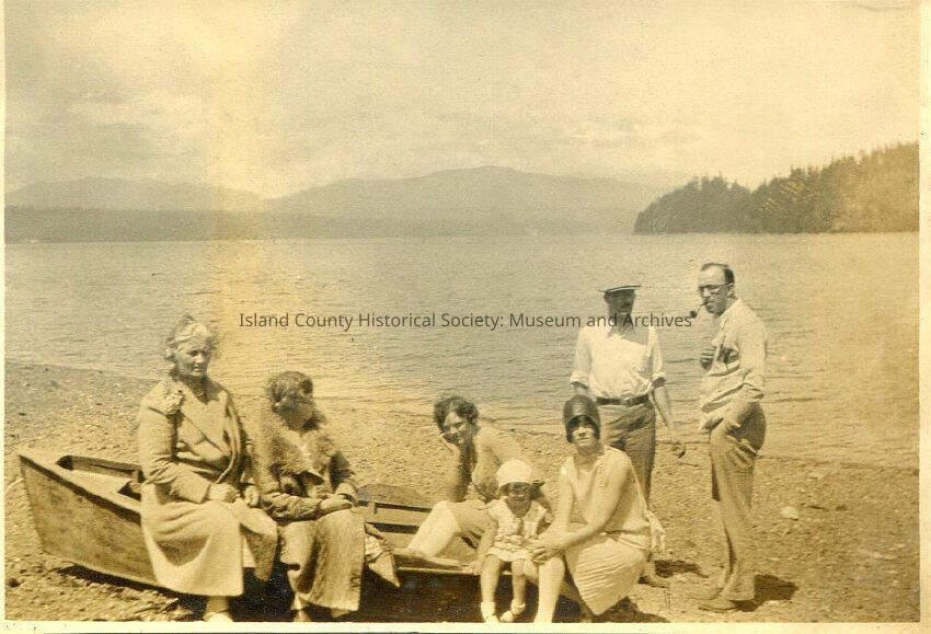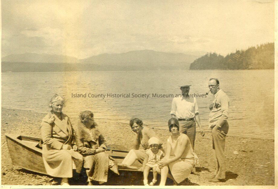 A black and white photo of a group of men, women and a girl on the beach. The women and girl are sitting on and the men standing beside a row boat. Mountains in the background. One younger women and girl are wearing hats. One man is wearing a flat cap. One man is smoking a pipe.