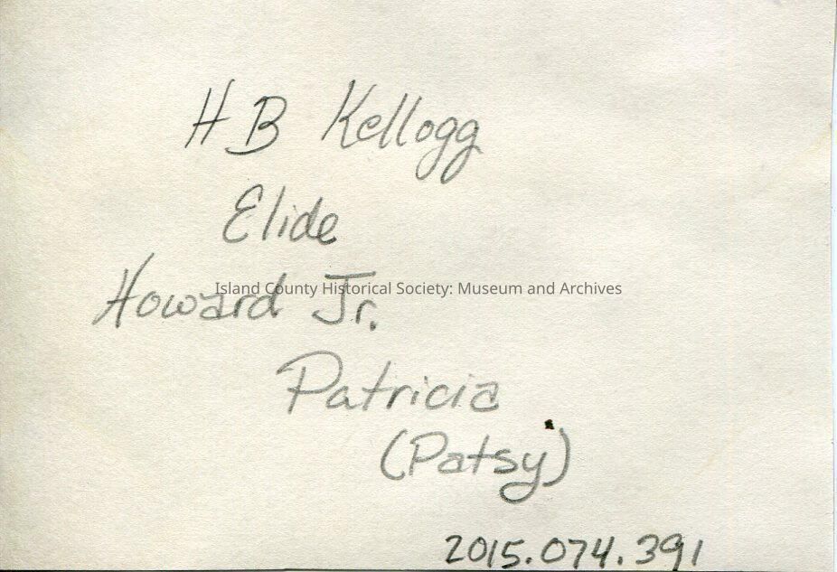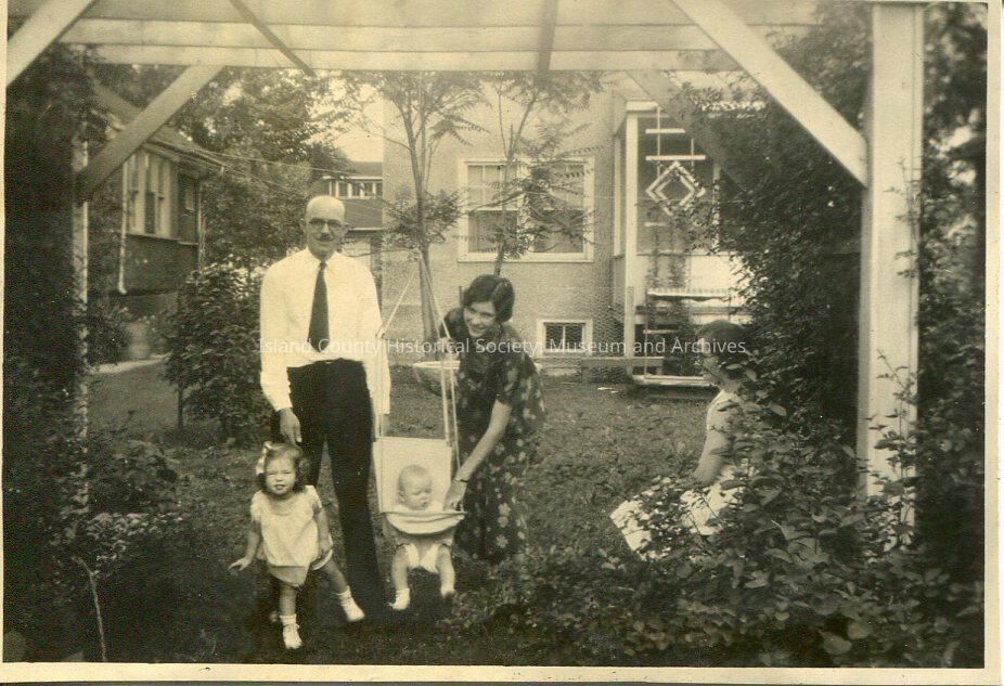A black and white photo of a man, two women and two children - little girl and a baby - in a backyard under a trellis. The baby is in a swing. One woman is sitting on the bench. On the back: " H. B. Kellogg Elida Howard Jr. Patricia (Patsy)"