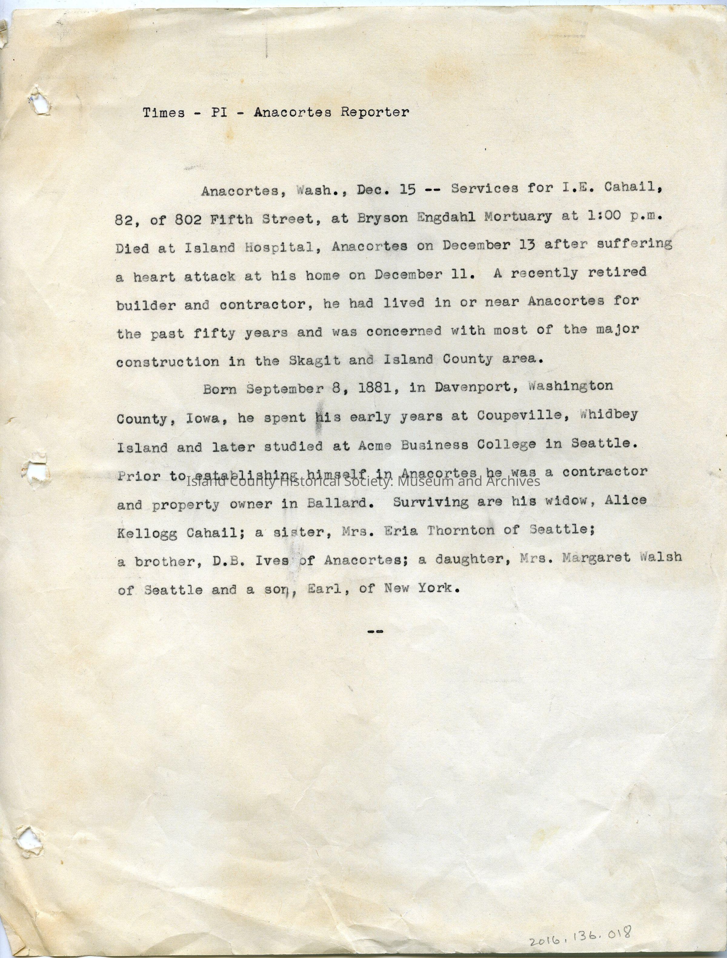Possibly a typed draft for the Times, Post-Intelligencer and Anacortes Reporter newspapers. Obituary for Ira Earle Cahail. Likely written by Alice Cahail. 1 page