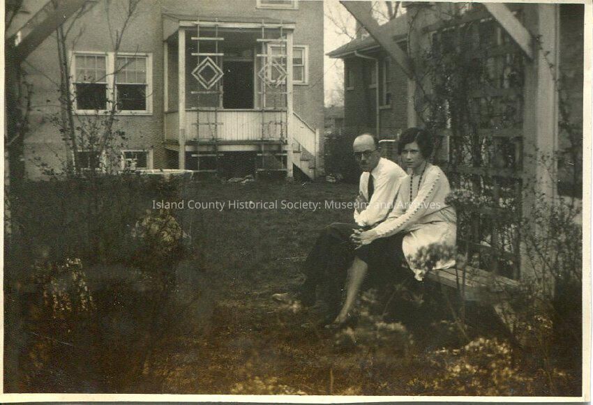 A black and white photo of a man and woman sitting on the bench under a trellis. He has glasses and is wearing a tie, she has on a long top with a necklace, skirt.