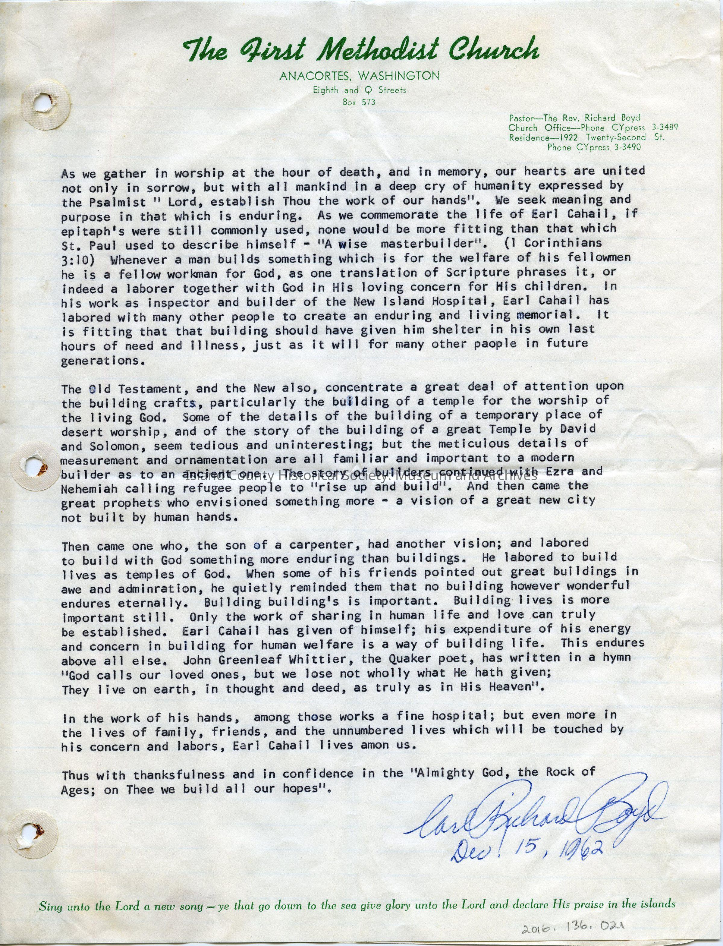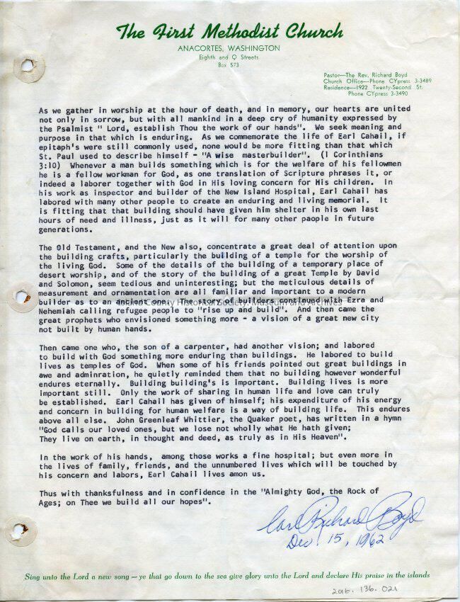 Typed up speech presumably given at Ira Earl Cahail's funeral. Typed and signed. By Richard Boyd of the First Methodist Church, Anacortes. 1 page