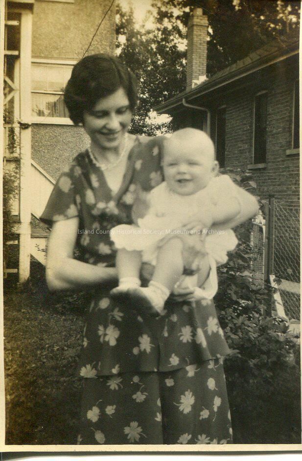 A black and white photo of a woman holding a baby. She has on a flowered top and skirt, necklace. On the back: "Elida K. and Howard Jr. "