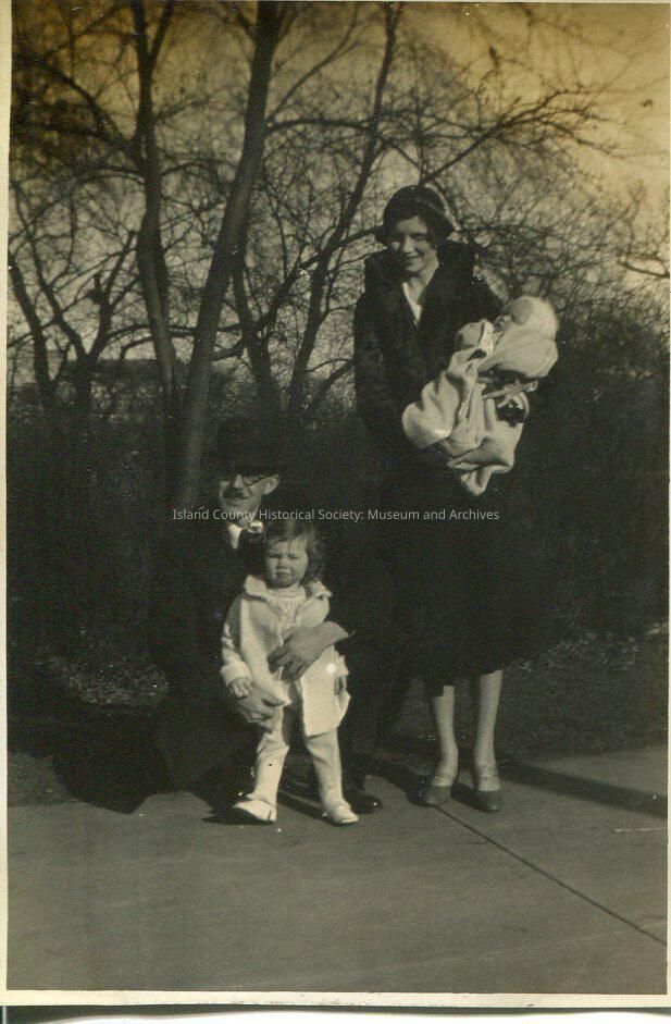 A black and white photo of a woman holding a baby. She has on a coat and hat. A man is sitting on a bench beside her, glasses, coat and hat, holding a little girl on his lap. She has on a coat and has a bow in her hair.
