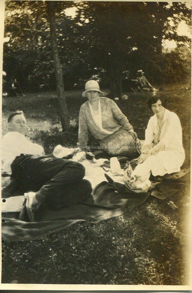 A black and white photo of a man lying on the ground on a blanket. Beside him two women are sitting. One is wearing a hat. There are other people in the background under trees.
