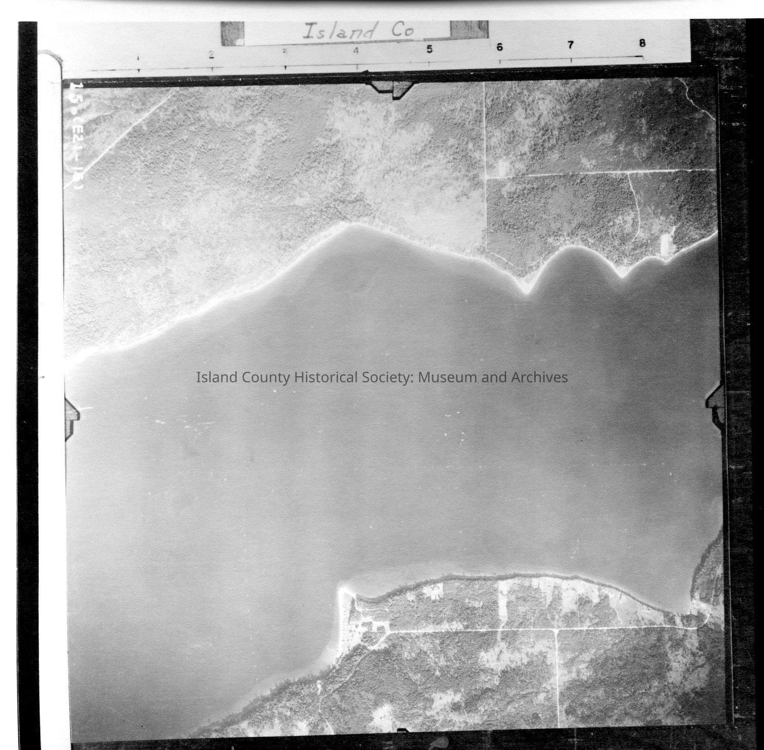 Donated by Island Conservation District Adjoins 2015.023.007 and 2015.023.009 Taken in the 1940s? 15-(E21-16) Holmes harbor runs north and south through the center of the image. label: Island Co See GIS for digital copies