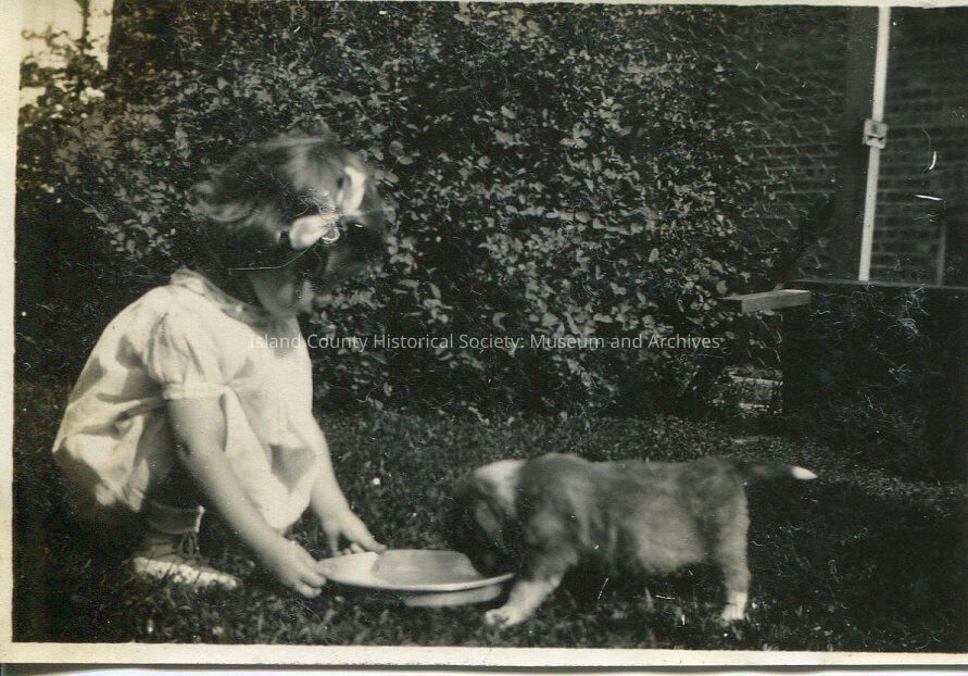 A black and white photo of a little girl with a dress, bow in her hair. She is squatting in the grass with her hands on a shallow pan for a puppy who is drinking. Patricia (Patsy) Kellogg.