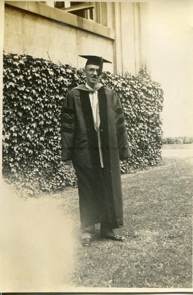 A black and white photo of a man in glasses and graduation robe/gown with three stripes on each arm - doctorate degree. He is standing in front of a hedge beside a building. Related photos: 2015.074.381 and 2015.074.397.