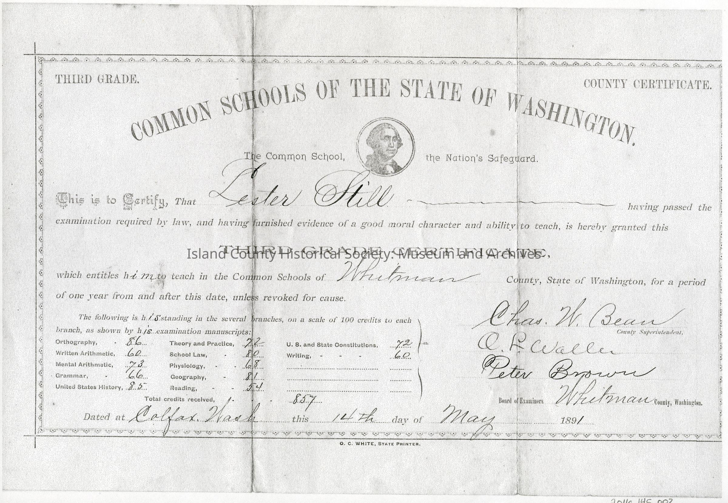 A copy of the 3rd Grade Certificate for Judge Still granting him to teach 3rd Grade in Whitman County. Issued by Common Schools of the State of Washington, 14 May, 1891.